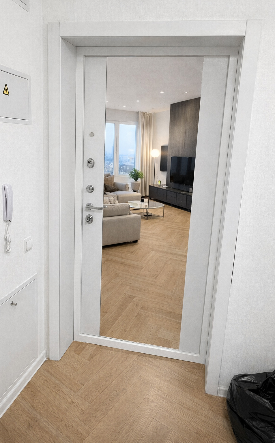 Входная дверь Labirint Лайн WHITE с широким зеркалом Максимум, цвет "Белый софт"