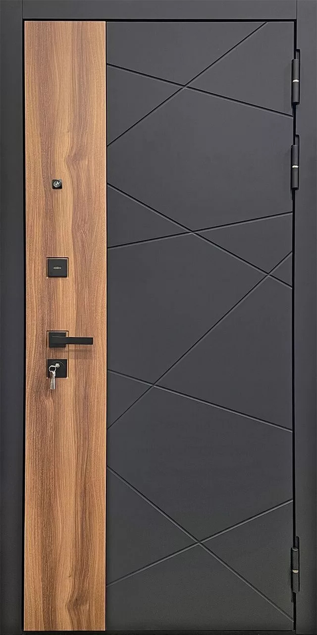 - Наружная панель: стальной лист с покраской Муар черный + панель МДФ 10мм Шагрень черная + вставка Вяз Барон темный